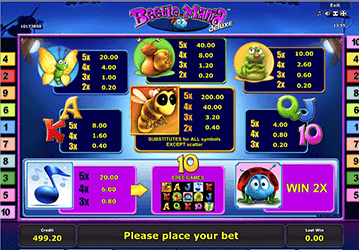 Интересный эмулятор обладает такой символикой, как улитка и буквенные обозначения, бабочка и пчела, зеленая гусеница и яркая божья коровка. Фиолетовая нота – Скаттер, а полосатая пчелка – Вайлд. За пятерку пчелок гэмблеры заработают 5 000 кредитов, а за мультяшных улиток начисляется до 1 000 жетонов.