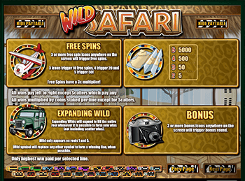 Игровой автомат Wild Safari обеспечит игроков дикими эмоциями. Помогут в этом особые символы слота – Вайлд, Скаттер и Бонус. Ими стали слон, носорог и лев. Впечатляет бонусная игра, в ней игрок выберет локацию для фото и зверей, которых захочет сфотографировать. За них и зачисляются выплаты. «Вишенкой» игры станет рисковый раунд, который после каждого удачного спина станет подспорьем для увеличения выплат за него в два раза.