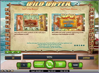 Wild Water – игровой автомат посвященный покорителям волн – серфингистам. Разработчики Netent, вдохновившись смелостью таких людей, которых не останавливают многочисленные опасности, решили создать нечто экстраординарное, увлекательное и очень прибыльное. Но главное достоинство игрового аппарата заключается не в оригинальном сюжете. В первую очередь, азартная игра привлекает разнообразием бонусных опций, которые делают игровой процесс невероятно выгодным.